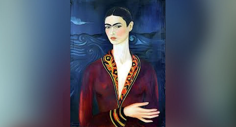 ஐரோப்பிய, மெக்சிகன் பாணிகளின் கலவையாக இருந்தது அந்த ஓவியம். வைன் சிவப்பு எனப்படும் ஆழ்ந்த வண்ணத்திலான வெல்வட்டு ஆடையில் தங்கச் சரிகையில் பூவேலைப்பாடு செய்யப்பட்டிருந்தது. அமைதி தவழும் முகத்தில் தீர்க்கமான பார்வைகொண்ட கண்கள், மெலிந்த கழுத்து, முன்னே நிற்பவரைத் தொடுவதுபோல நீண்டிருக்கும் வலது கை எனக் கற்பனை நவிற்சி மிகுந்திருந்தது. வானும் கடலும் ஒன்று கலக்கும் அடர்நீலப் பின்னணி அவருடைய உணர்வுகளைச் சித்தரித்தது.
