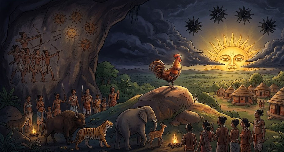 சேவலின் ‘கொக்கரக்கோ’ என்கிற ஒலியைக் கேட்டபிறகே சூரியன் வெளியே வருவதாக முண்டா இன மக்களிடையே இன்றுவரை நம்பிக்கை உள்ளது. நாம் வாழும் இப்பூமியில் உள்ள உயிர்களுக்கான ஆதாரமாகச் சூரியன் திகழ்வதையும் இயற்கை சமநிலையின் முக்கியத்துவத்தையும் இக்கதை உணர்த்துகிறது.