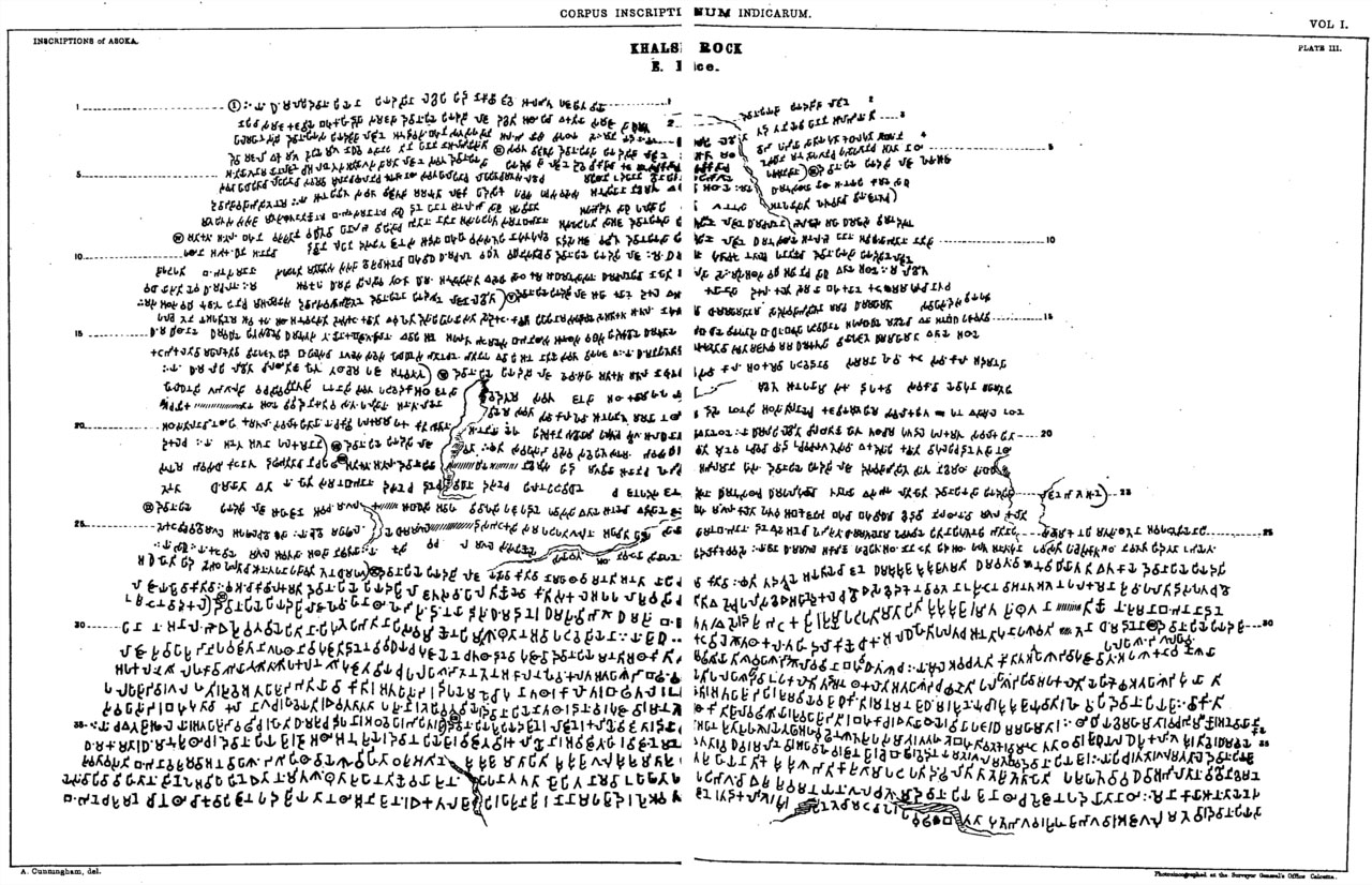 ‘தேவர்களுக்கு அன்பானவன் ப்ரியதர்சி, அபிஷேகம் செய்யப்பட்டு எட்டாம் ஆண்டில் கலிங்க நாட்டினை வென்றான். அந்நாட்டிலிருந்து ஒரு இலட்சத்து ஐம்பதாயிரம் மக்கள் அப்புறப்படுத்தப்பட்டனர்; ஒரு இலட்சம் மக்கள் அங்கேயே கொல்லப்பட்டனர்; அதைவிடப் பல மடங்கு பேர் பின்னால் அழிந்தனர்.