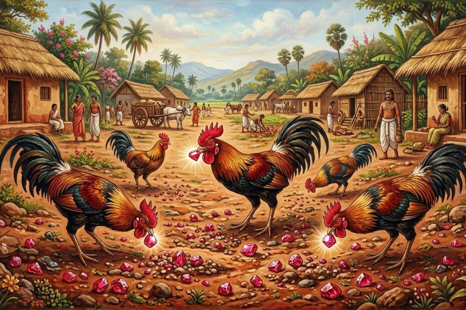கம்பராமாயணத்தின் பால காண்டத்தில் நாட்டுப் படலத்தில் கோசல நாட்டின் செல்வச் சிறப்பைக் கூறும்போது, ‘சேவல்கள் குப்பையைக் கிளறும்போது அக்குப்பைமேட்டில் வெளிப்பட்டு ஒளிர்கின்ற மாணிக்க மணிகளைப் பார்த்து, மின்மினிப் பூச்சி எனத் தவறாக எண்ணி, அவற்றை ஒளி தருவதற்காகக் குருவிகள் தம் கூட்டிற்குக் கொண்டுபோய்ச் சேர்க்கின்றன’ என்று உரைத்திருப்பார் கம்பர்.